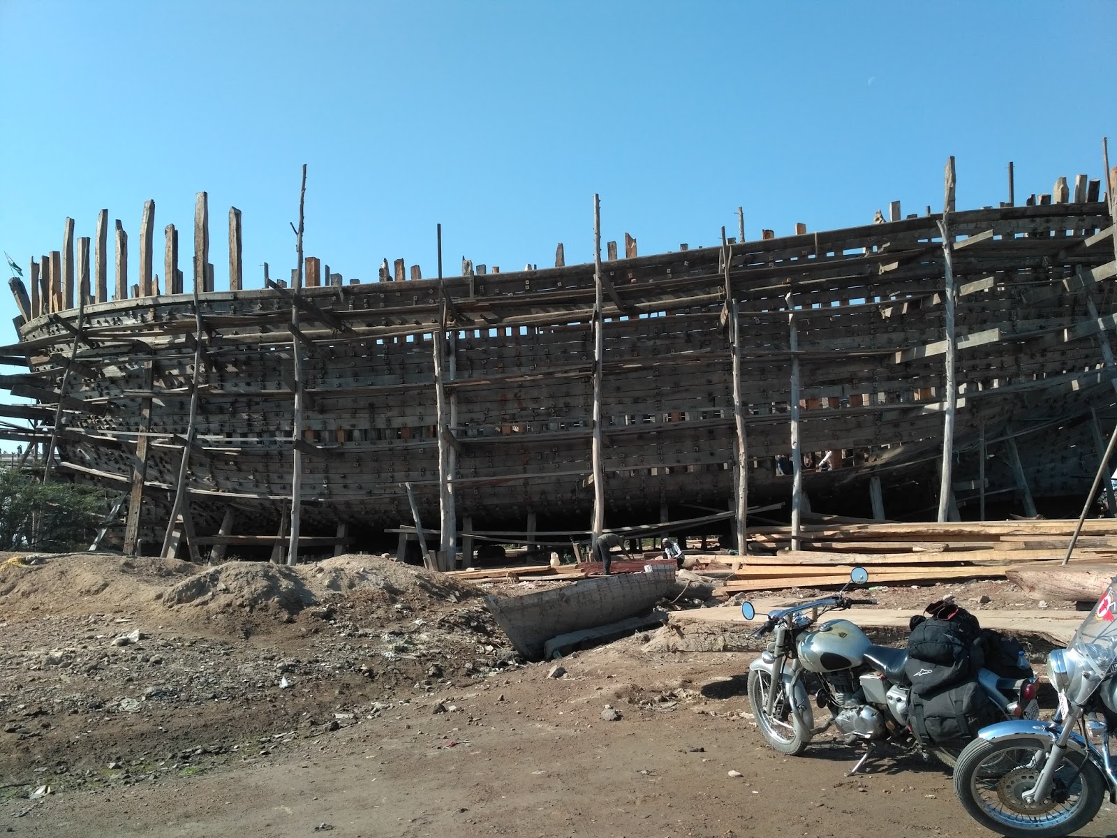 Our plan was to go to the Vijay Vilas Palace and the ship-building yard today. The former was a well-maintained summer palace of the royalty. The walls are adorned with old photos and stories of the royal exploits. On the roof, you can see that the palace is surrounded by a sea of green. There was a photo shoot going on there, so we let them be and went back to Mandvi town to the ship-building yard. While the surroundings aren't very clean, it is fascinating to watch the ships being built. We spoke to one of the supervisors there, who told us that these ships will eventually ply near the Middle East and will carry grain and other food products for short distances.